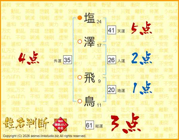 塩(24画)澤(17画) 飛(9画)鳥(11画)