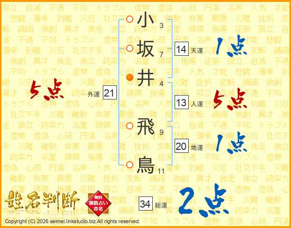 小(3画)坂(7画)井(4画) 飛(9画)鳥(11画)