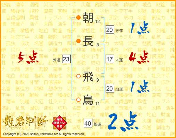 朝(12画)長(8画) 飛(9画)鳥(11画)