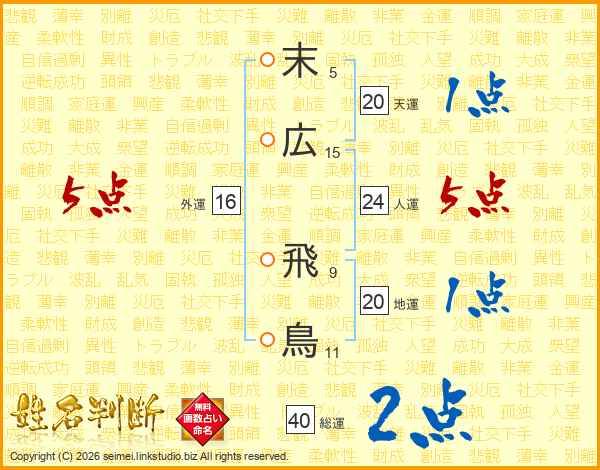 末(5画)広(15画) 飛(9画)鳥(11画)