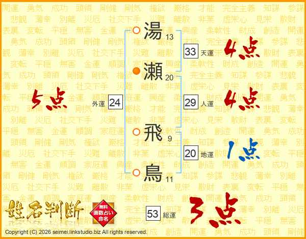 湯瀬飛鳥さんの総運は53画の3点!