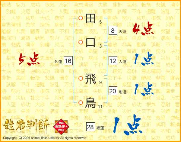 田(5画)口(3画) 飛(9画)鳥(11画)