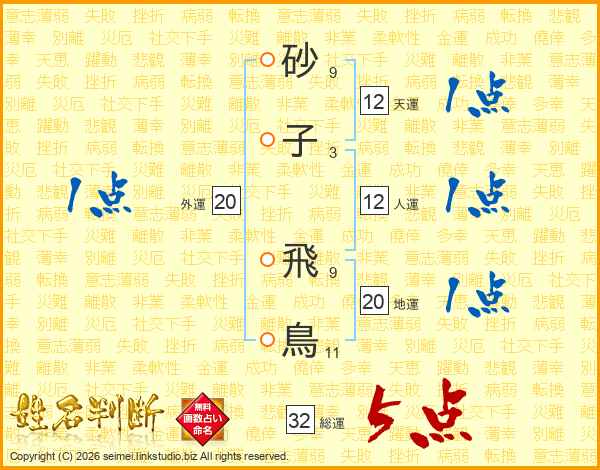 砂(9画)子(3画) 飛(9画)鳥(11画)