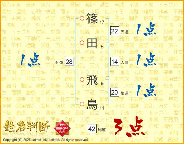 篠(17画)田(5画) 飛(9画)鳥(11画)