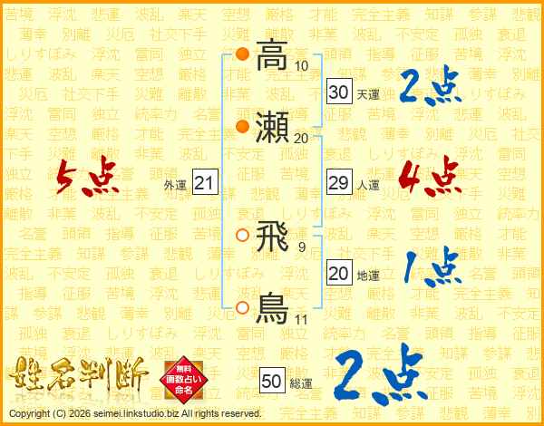 高(10画)瀬(20画) 飛(9画)鳥(11画)