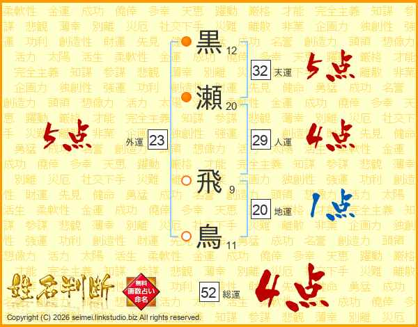 黒(12画)瀬(20画) 飛(9画)鳥(11画)