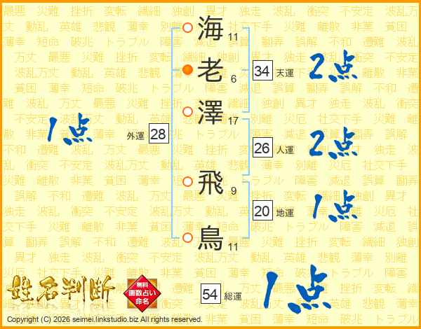 海(11画)老(6画)澤(17画) 飛(9画)鳥(11画)