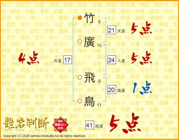 竹(6画)廣(15画) 飛(9画)鳥(11画)