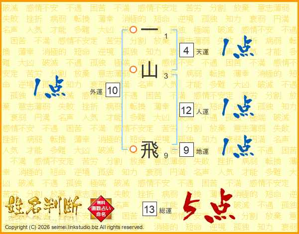 生活面を象徴する運勢です。外部から受ける影響力を表し、結婚運、家庭運や職場、環境への順応性を表します。総運から人運を引いた画数。姓や名が1文字の場合を除く。