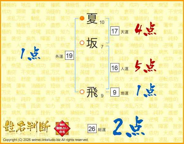 夏坂飛さんの総運は26画の2点!