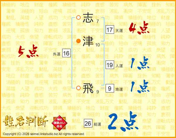 あなたの人生を表す1番重要な運勢です。生涯を通じて影響する総合運となり、主に50歳以降の晩年期に影響を及ぼします。苗字と名前の合計画数。