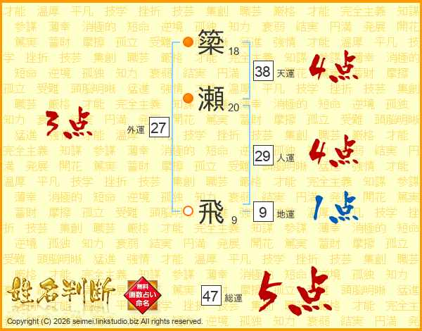 簗瀬飛さんの総運は47画の5点!