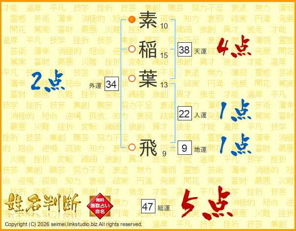 素(10画)稲(15画)葉(13画) 飛(9画)