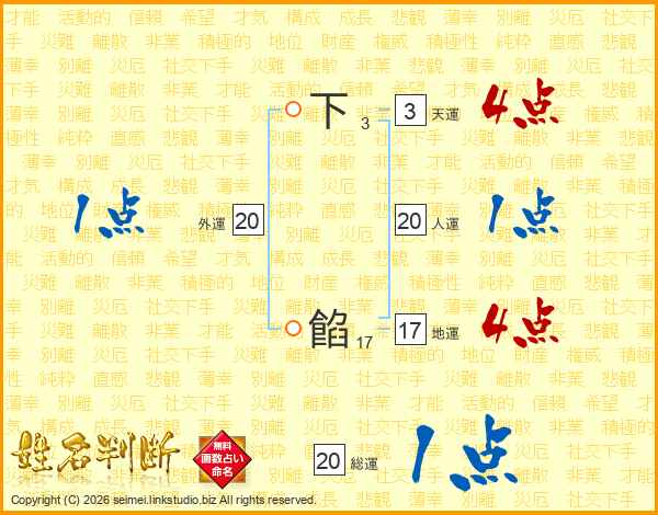 生活面を象徴する運勢です。外部から受ける影響力を表し、結婚運、家庭運や職場、環境への順応性を表します。総運から人運を引いた画数。姓や名が1文字の場合を除く。