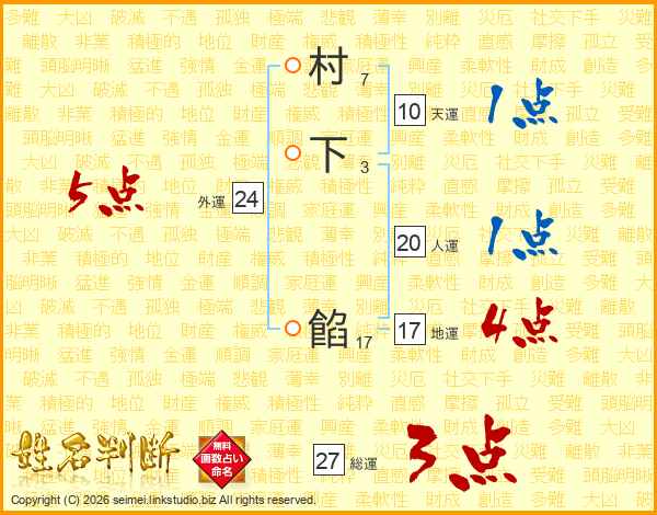 生活面を象徴する運勢です。外部から受ける影響力を表し、結婚運、家庭運や職場、環境への順応性を表します。総運から人運を引いた画数。姓や名が1文字の場合を除く。