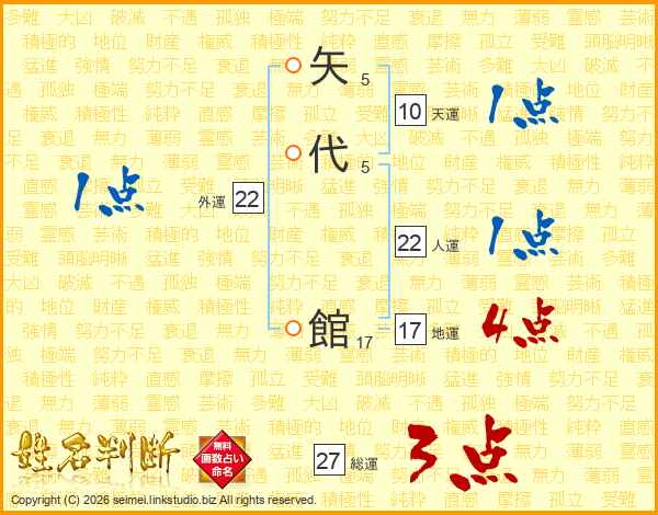 生活面を象徴する運勢です。外部から受ける影響力を表し、結婚運、家庭運や職場、環境への順応性を表します。総運から人運を引いた画数。姓や名が1文字の場合を除く。