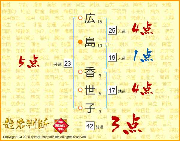 広(15画)島(10画) 香(9画)世(5画)子(3画)