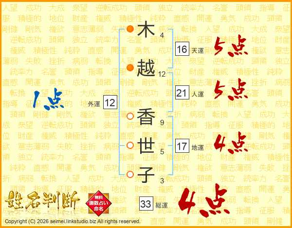 木(4画)越(12画) 香(9画)世(5画)子(3画)