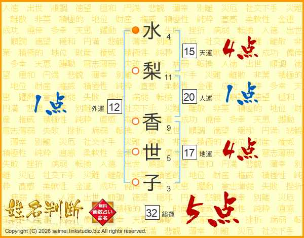 水(4画)梨(11画) 香(9画)世(5画)子(3画)