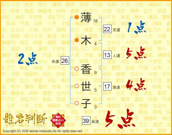 薄(18画)木(4画) 香(9画)世(5画)子(3画)