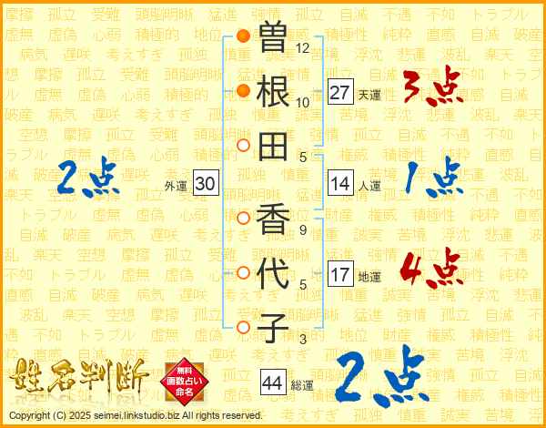 曽(12画)根(10画)田(5画) 香(9画)代(5画)子(3画)