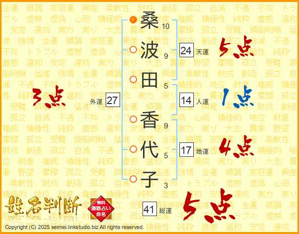 桑(10画)波(9画)田(5画) 香(9画)代(5画)子(3画)