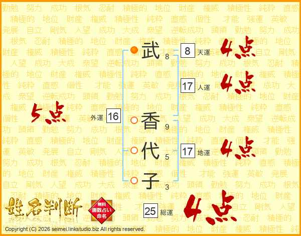 武(8画) 香(9画)代(5画)子(3画)