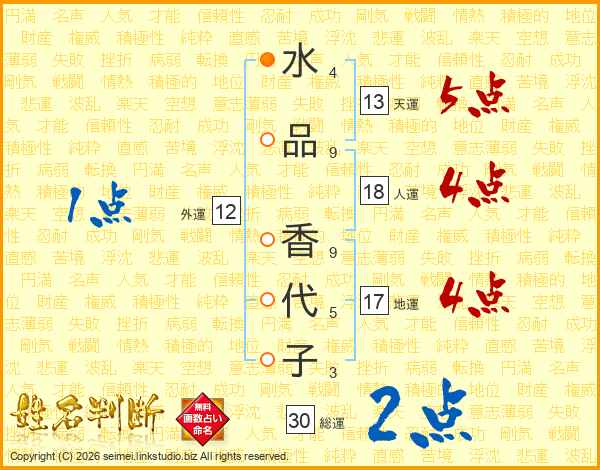 水(4画)品(9画) 香(9画)代(5画)子(3画)