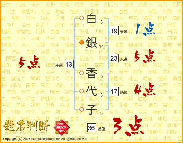 白(5画)銀(14画) 香(9画)代(5画)子(3画)