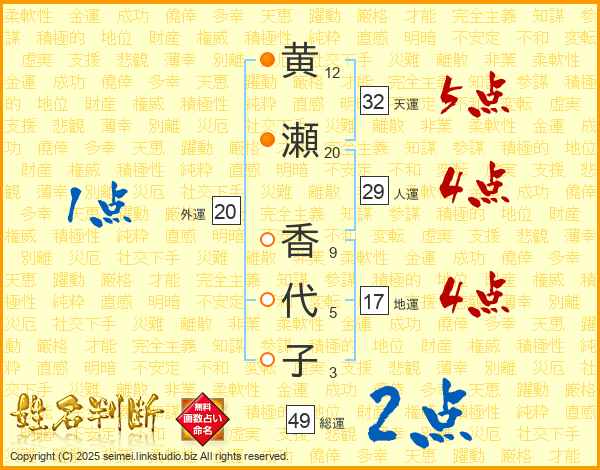 黄瀬香代子さんの総運は49画の2点!