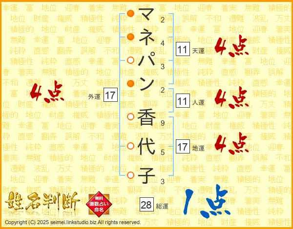 マ(2画)ネ(4画)パ(3画)ン(2画)  香(9画)代(5画)子(3画)