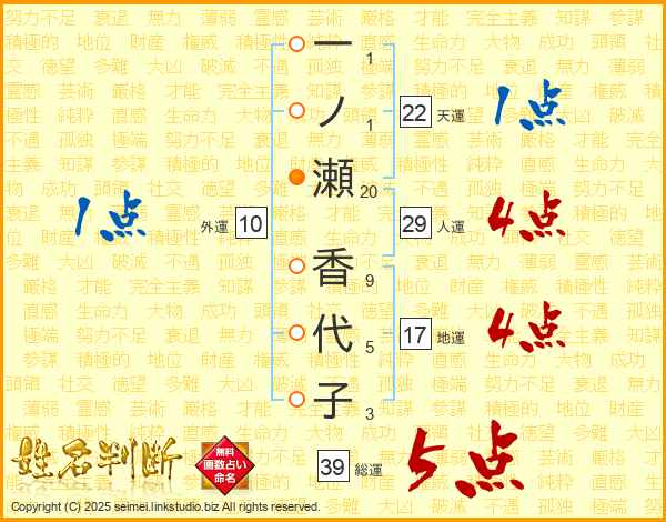 一(1画)ノ(1画)瀬(20画) 香(9画)代(5画)子(3画)