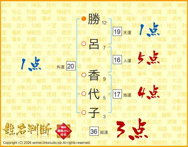勝(12画)呂(7画) 香(9画)代(5画)子(3画)