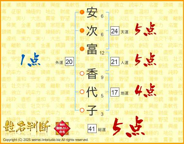 安(6画)次(6画)富(12画)  香(9画)代(5画)子(3画)