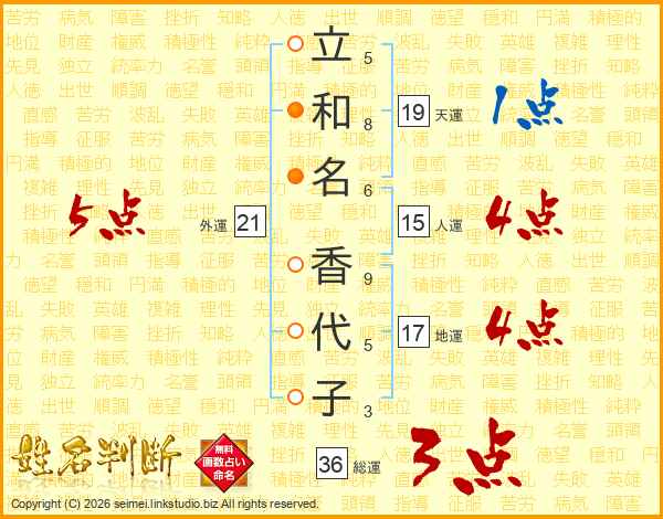 立(5画)和(8画)名(6画) 香(9画)代(5画)子(3画)