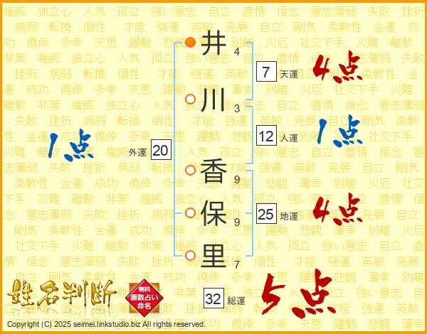 井(4画)川(3画) 香(9画)保(9画)里(7画)