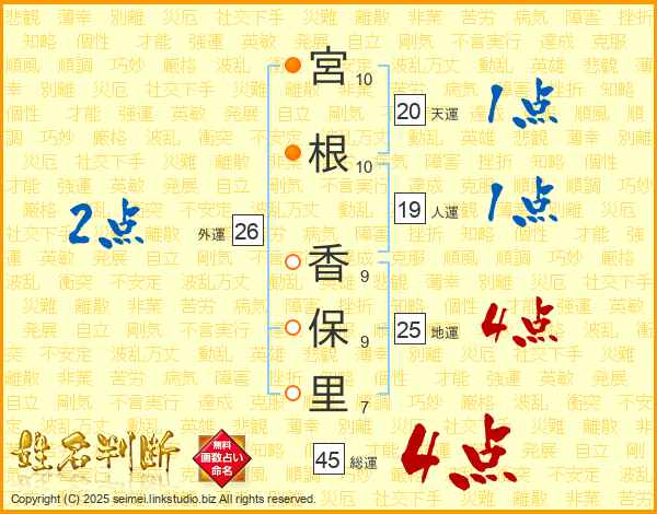 宮(10画)根(10画) 香(9画)保(9画)里(7画)