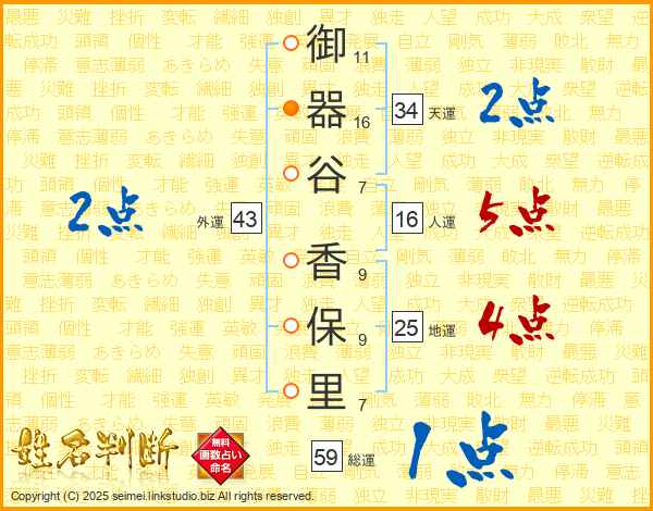 御(11画)器(16画)谷(7画) 香(9画)保(9画)里(7画)
