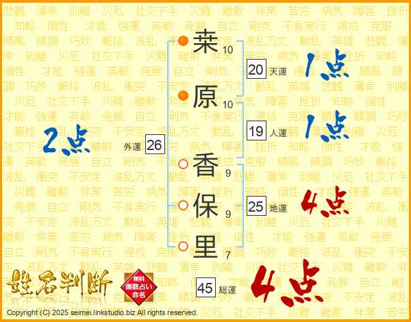 生活面を象徴する運勢です。外部から受ける影響力を表し、結婚運、家庭運や職場、環境への順応性を表します。総運から人運を引いた画数。姓や名が1文字の場合を除く。