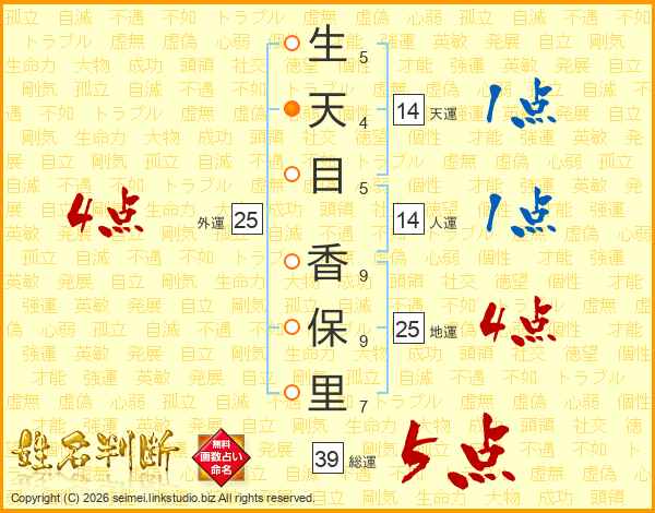 生(5画)天(4画)目(5画) 香(9画)保(9画)里(7画)
