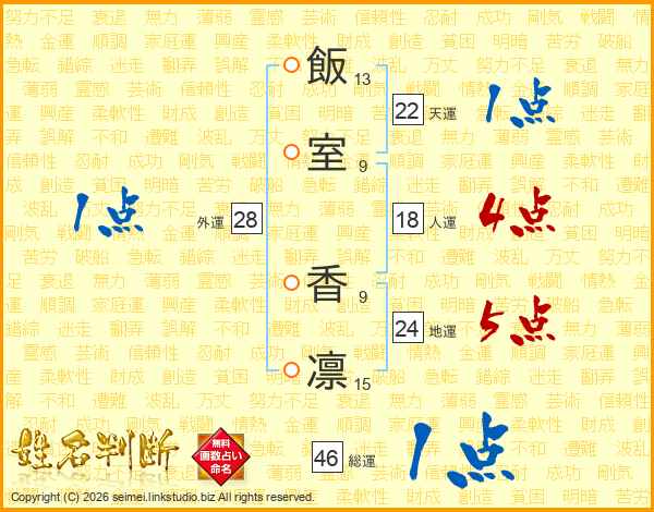 生活面を象徴する運勢です。外部から受ける影響力を表し、結婚運、家庭運や職場、環境への順応性を表します。総運から人運を引いた画数。姓や名が1文字の場合を除く。