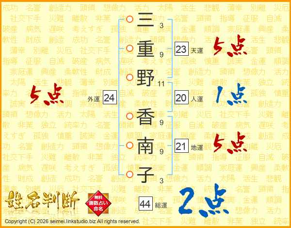 三(3画)重(9画)野(11画) 香(9画)南(9画)子(3画)