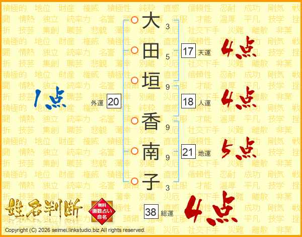 大(3画)田(5画)垣(9画) 香(9画)南(9画)子(3画)