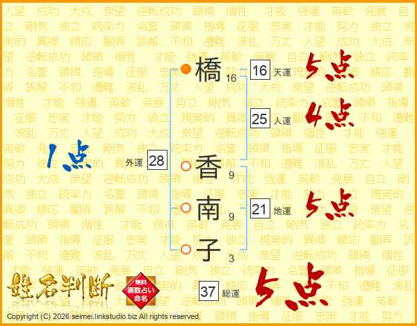 あなたの人生を表す1番重要な運勢です。生涯を通じて影響する総合運となり、主に50歳以降の晩年期に影響を及ぼします。苗字と名前の合計画数。