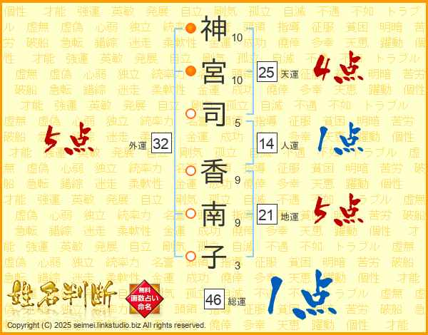 神(10画)宮(10画)司(5画) 香(9画)南(9画)子(3画)
