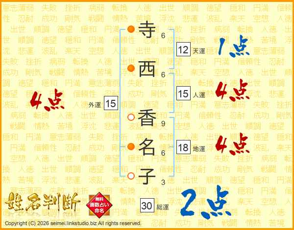 寺(6画)西(6画) 香(9画)名(6画)子(3画)