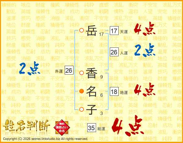 岳(17画) 香(9画)名(6画)子(3画)