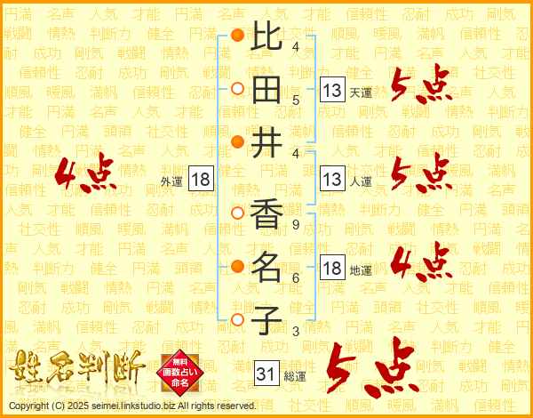 比(4画)田(5画)井(4画) 香(9画)名(6画)子(3画)