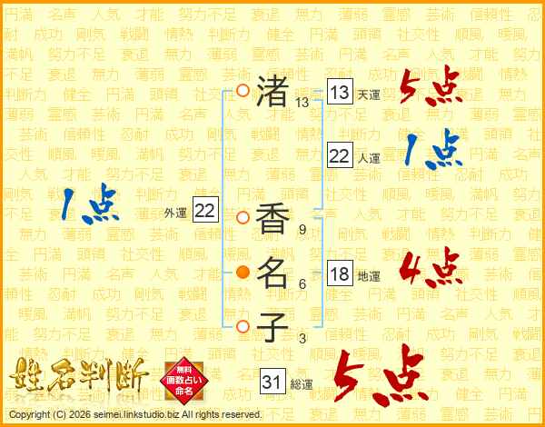 生活面を象徴する運勢です。外部から受ける影響力を表し、結婚運、家庭運や職場、環境への順応性を表します。総運から人運を引いた画数。姓や名が1文字の場合を除く。