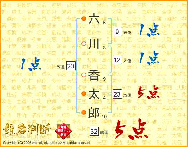 六(6画)川(3画) 香(9画)太(4画)郎(10画)
